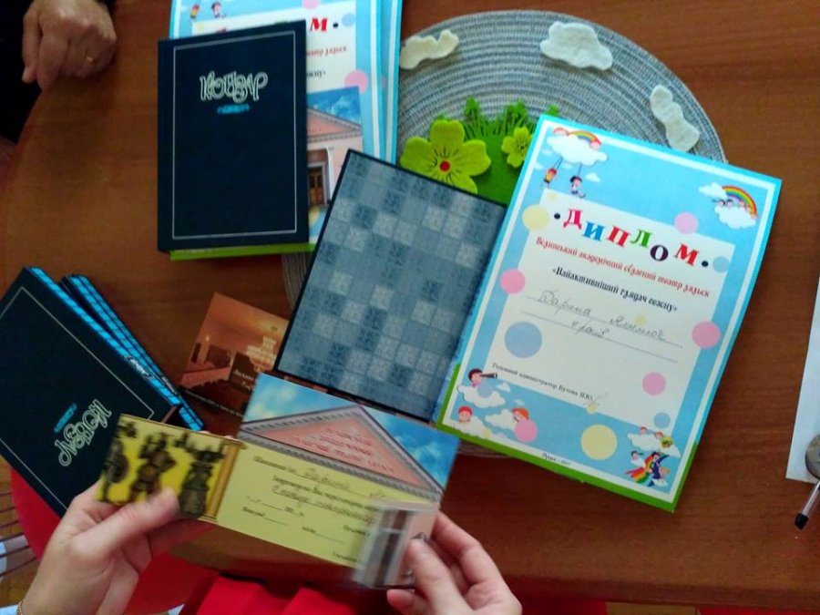За друге та третє місце: одне запрошення на виставу, диплом та “Кобзар” Т. Г. Шевченка.