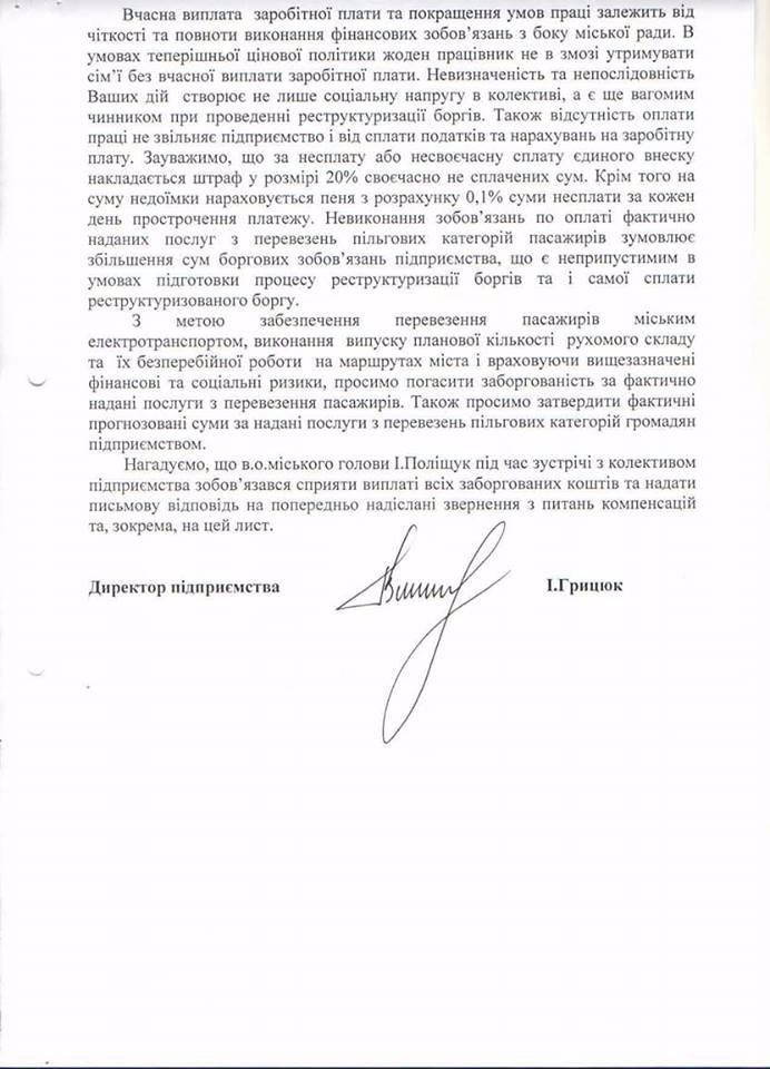 "Підприємство не є політичним і ніколи таким не буде. Якщо є якісь порушення по моїй роботі, то можна звертатися до контролюючих органів. Якщо є щось особисте до мене - то це несерйозно. Від цього не повинні страждати ні працівники, ні жителі міста", - додав Грицюк.