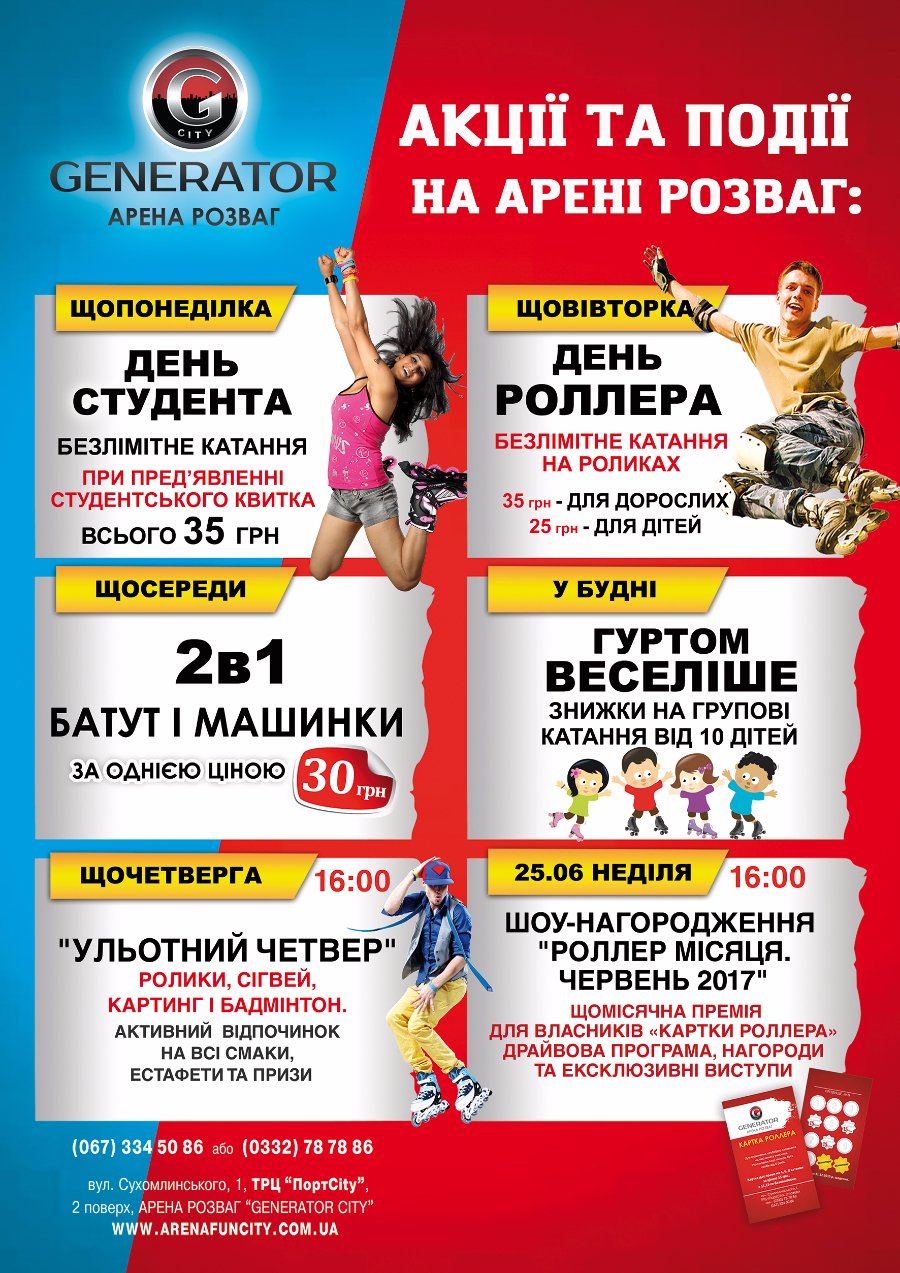 Арена розваг "Generator City" дарує акційні будні для любителів покататися. Щопонеділка для студентів - безлімітне катання всього за 35 гривень. У вівторок - День ролера, - повідомили у ТРЦ "ПортCity".