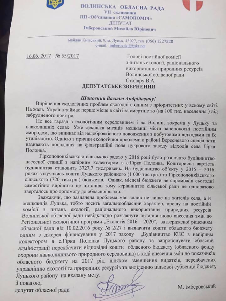 "Із високих кабінетів декларують, що екологія Волині в пріоритеті, програма "Екологія 2016-2020" діє, підприємство, що виробляє біоетанол зупинене, місцеві підприємці (яких до речі ловили із несанкціонованим зливом у міську каналізацію відходів виробництва) заявляють що невинні. а тим часом в Луцьку смердить, а повітря за своїми показниками у "лідерах" в загальноукраїнському масштабі..." - йдеться в зверненні депутата до голови екологічної комісії Волиньради Василя Столяра.