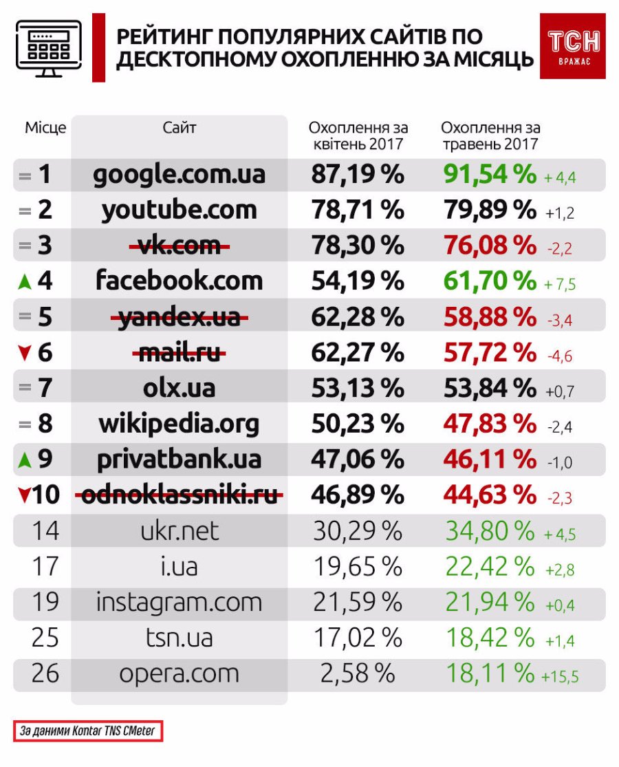 Але рекордсменом зі зростання в травні став сайт Opera.com, він набрав додаткових 15,5% охоплення і вперше увійшов до Топ-30. Тут все просто, у цьому браузері є вбудований VPN. Перш за все, заборона російських сайтів відобразилася на зростанні Facebook – як альтернативи для частини аудиторії ВКонтакте і Однокласники, також отримали частку аудиторію і Mail.ru – портали з поштовим сервісом Google.com, Ukr.net та i.ua.