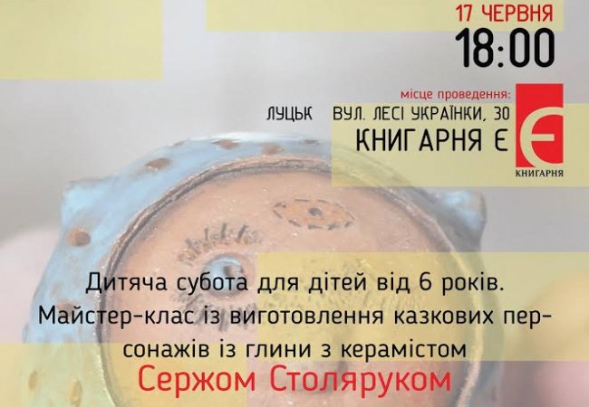 У Луцьку книгарня «Є» запрошує дітей віком від 5 років, а також їхніх батьків і всіх охочих на «глиняний» майстер-клас із художником-керамістом Сержем Столяруком.