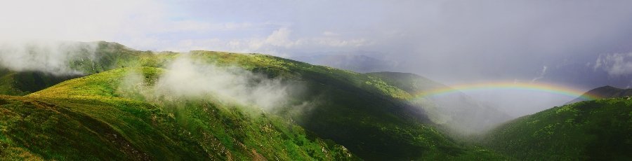 Фото зроблене в поході Чорногорським хребтом (Карпати). Це був другий день нашого походу, другий день під дощем і в хмарах. Коли підходили до о. Бребенескул, хмари трохи розійшлися і в долині в променях сонця з'явилася веселка. Через пів години небо знову затягнуло хмарами і пішов дощ...