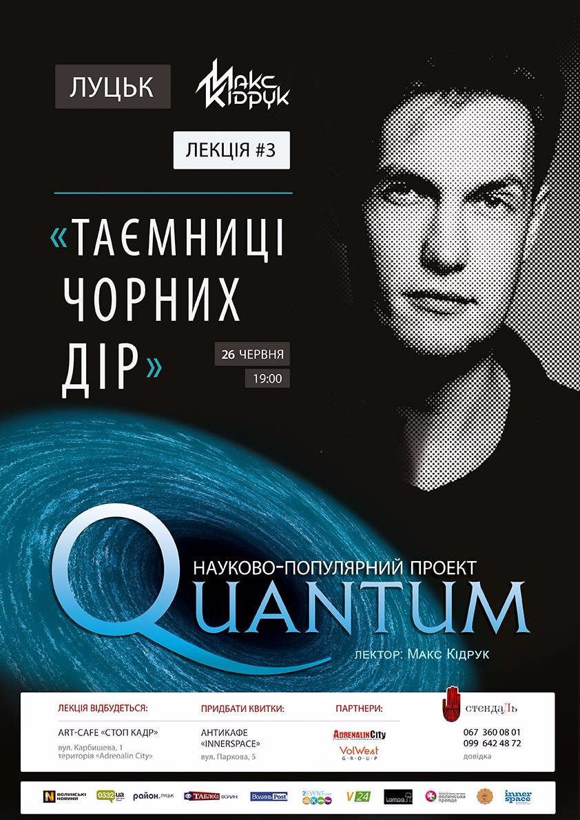 Над питанням, що таке чорні діри вже кількадесят років роздумовують провідні світові астрофізики. Про найновіші дослідження розповість у Луцьку письменник Макс Кідрук на третій лекції науково-популярного проекту «Quantum» - «Таємниці чорних дір».