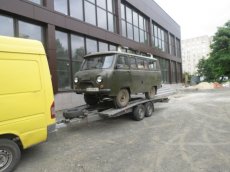 Волотери везуть відремонтований автомобіль швидкої допомоги на причепі. Цей автомобіль стане в нагоді бійцям на передовій у зоні АТО. Ще один автомобіль Т-4 своїм ходом відправиться в зону бойових дій, де допомагатиме військовим виконувати бойові завдання.