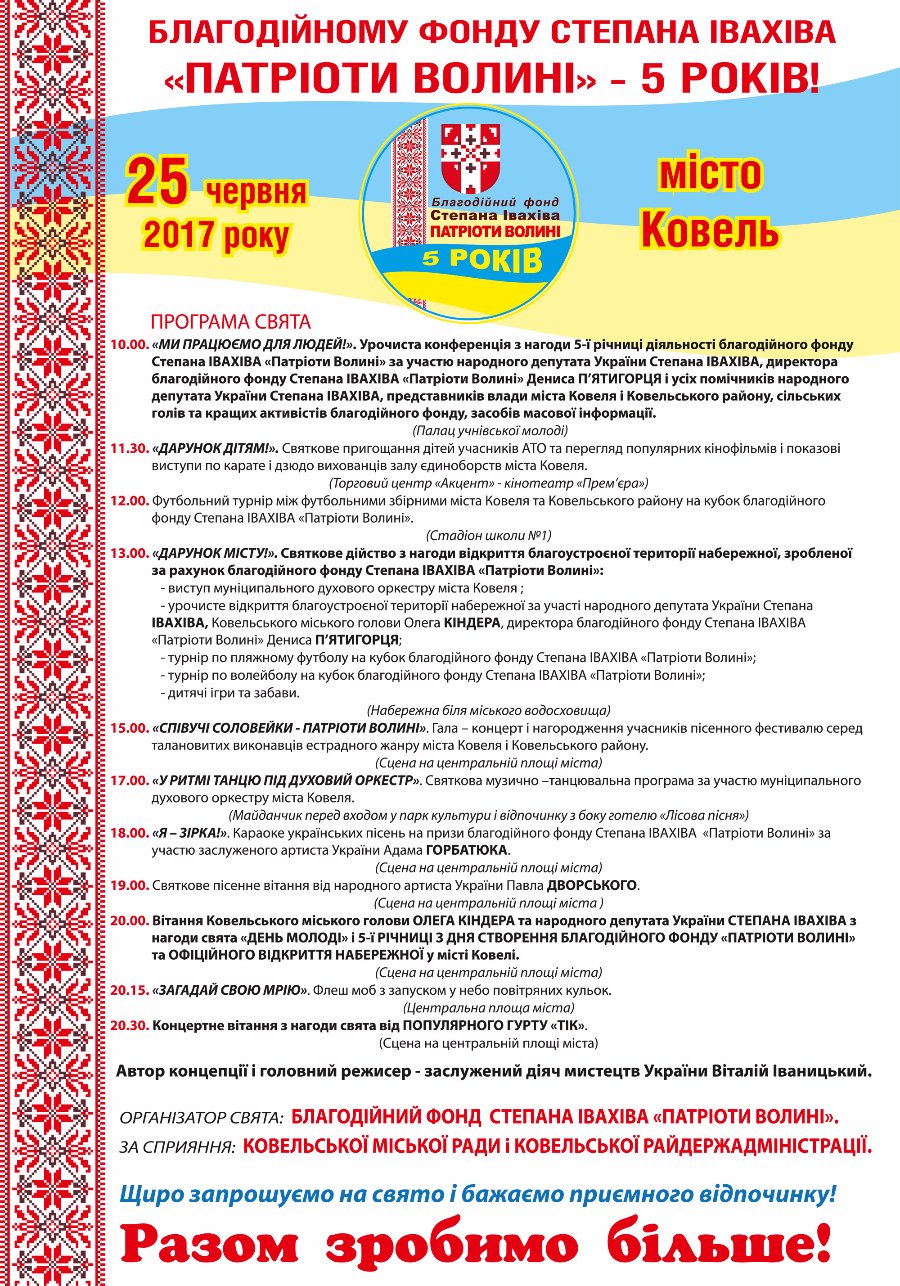 Благодійний фонд Степана Івахіва «Патріоти Волині» запрошує волинян відсвяткувати п’ятиріччя Фонду.