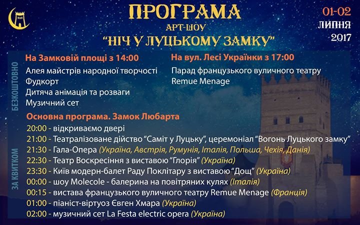 Арт-шоу «Ніч у Луцькому замку» відбудеться 1-2 липня у Луцькому замку. Ознайомитися з програмою фестивалю можна на сторінці у Фейсбук. Придбати квитки онлайн - на порталі kasa.in.ua, або в точках продажу за адресою: вул. Стрілецька, 31 (Магазин “Кобза”), вул. Лесі Українки, 17 (музичний магазин “Медісон”) та театральний Майдан, 1.