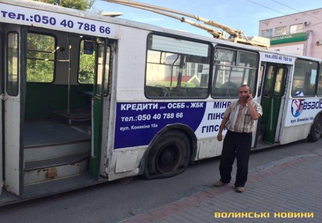 У луцького "рогатого", що курсував за маршрутом № 3, лопнуло колесо. Інцидент трапився сьогодні близько 18.40 у Луцьку, поблизу драмтеатру.