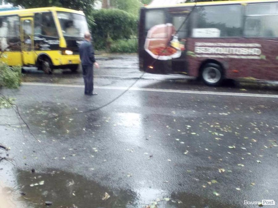 Внаслідок сильної бурі в Луцьку на багатьох вулицях повалені дерева, пошкоджені лінії електропередач та величезні калюжі.