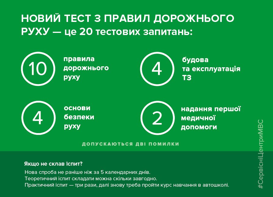 Новий тест з Правил дорожнього руху, як і раніше, охоплюватиме 20 запитань, але тепер їх підбере комп’ютерна програма рандомним шляхом. На його проходження виділять 20 хвилин. 10 запитань буде присвячено ПДР України, по 4 – влаштуванню транспортних засобів та безпеки руху, ще 2 – першій медичній допомозі. Із 1 липня всі запитання будуть у відкритому доступі. Крім того, громадяни зможуть пройти тест онлайн на сайті Головного сервісного центру МВС.
