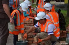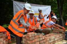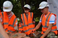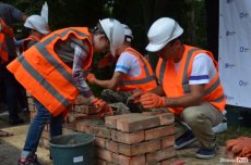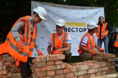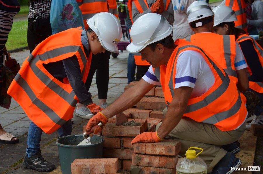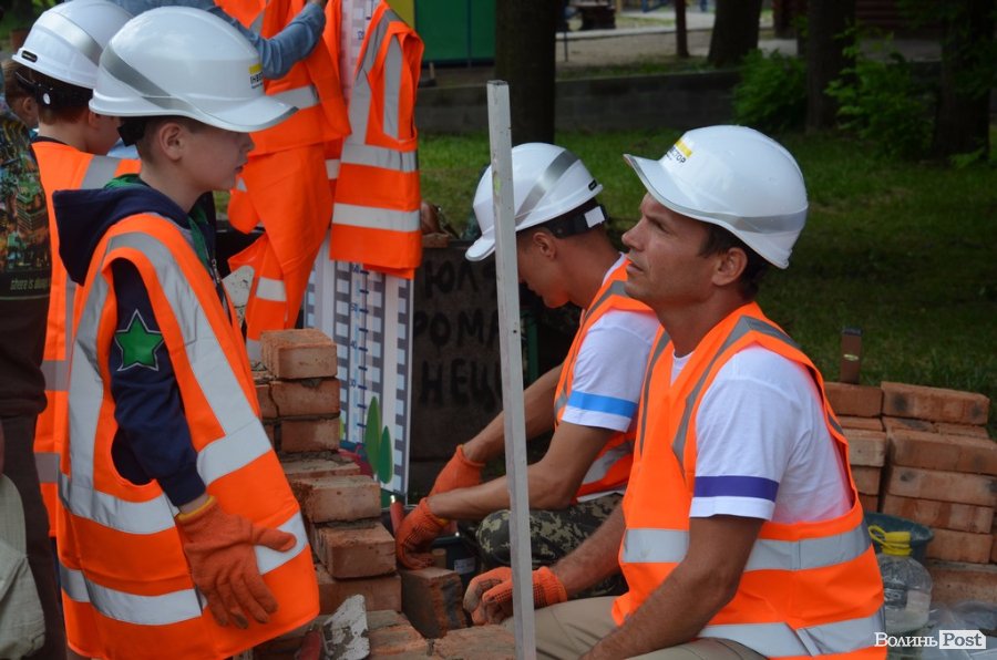 Майстер будівельних робіт Андрій Поліщук демонстрував дітям, як готувати розчин, виставляти стіну в рівень та як правильно вкласти цеглу.