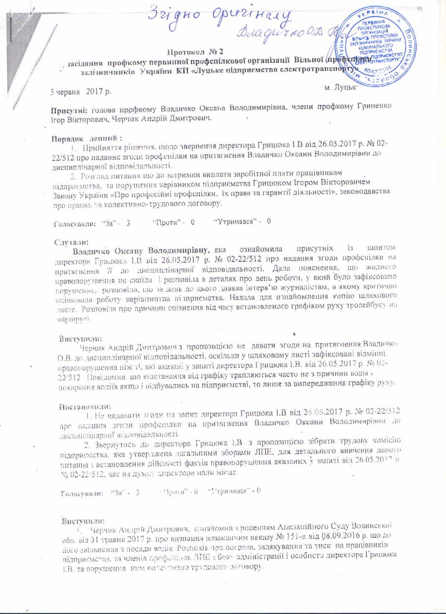 Підстав для звільнення дві - заява первинної профспілкової організації вільної профспілки залізничників України КП "Луцьке підприємство електротранспорту" від 06.06.2017 та лист Міністерства інфраструктури України від 21.06.2017 № 5912/10/10-17.