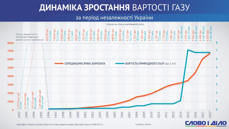 Станом на квітень 2017 року, за даними Держстату, середня заробітна плата по Україні складала майже 6,66 тис грн, а середня вартість кубометру газу для населення – 6,88 грн.