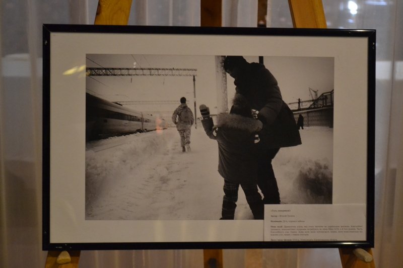 «Ця робота називається «Зустріч», і це зустріч дівчини з бійцем батальйону «Азов». Зображені на ній наші лучани – Василина Боруцька та Богдан Бальбуза. Це одна зі світлин з благодійного календаря, який робила наша громадська організація. Автором фото насправді є Павло Березюк, а ми були до всього дотичні концептуально. Кожна фотографія цієї виставки має таку історію, яку можна прочитати одразу ж, без жодного тексту, за почуттями і відчуттями», – поділилася Євпак.