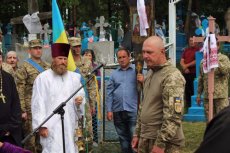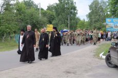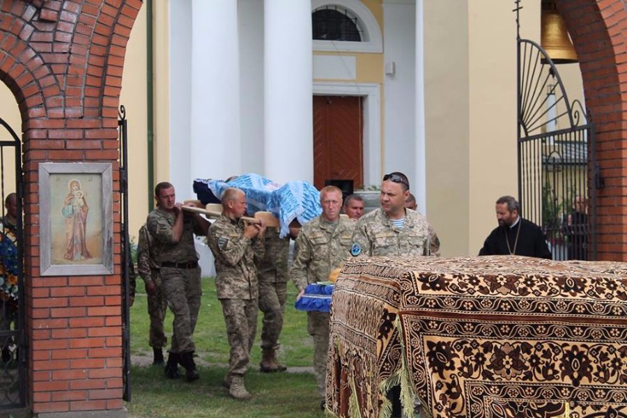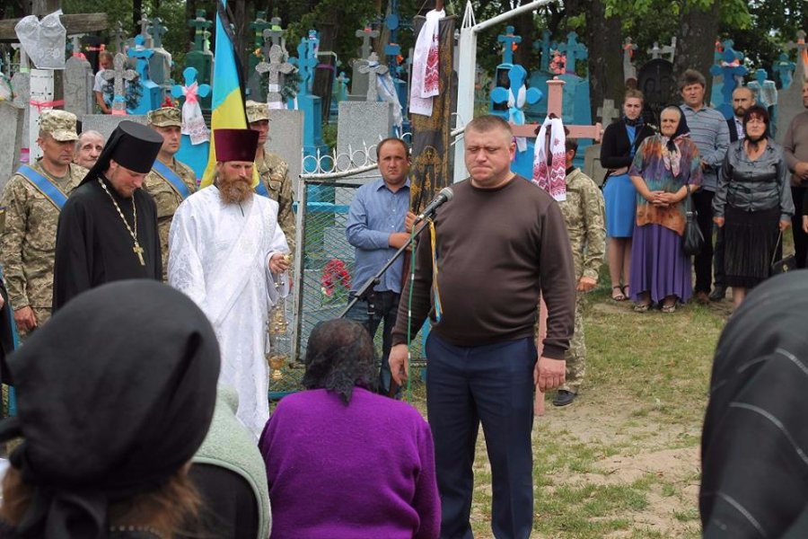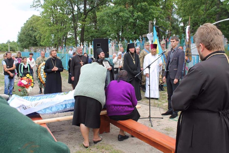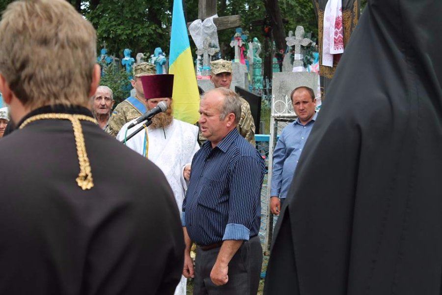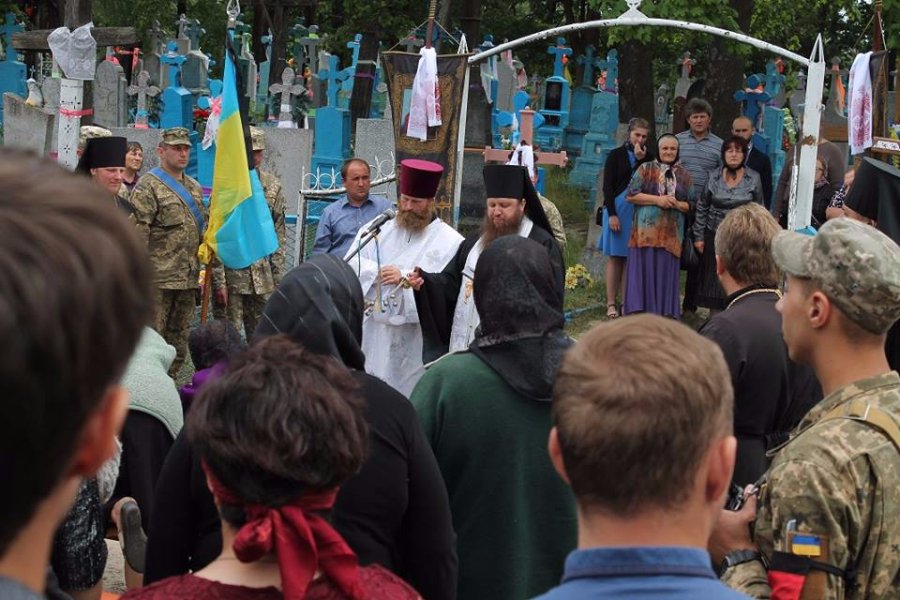 Від храму до кладовища учасники АТО несли на руках труну героя-захисника, вигукуючи патріотичні гасла. Біля кладовища відбулася поминальна панахида. За упокій душі бійця молився отець Арсеній.