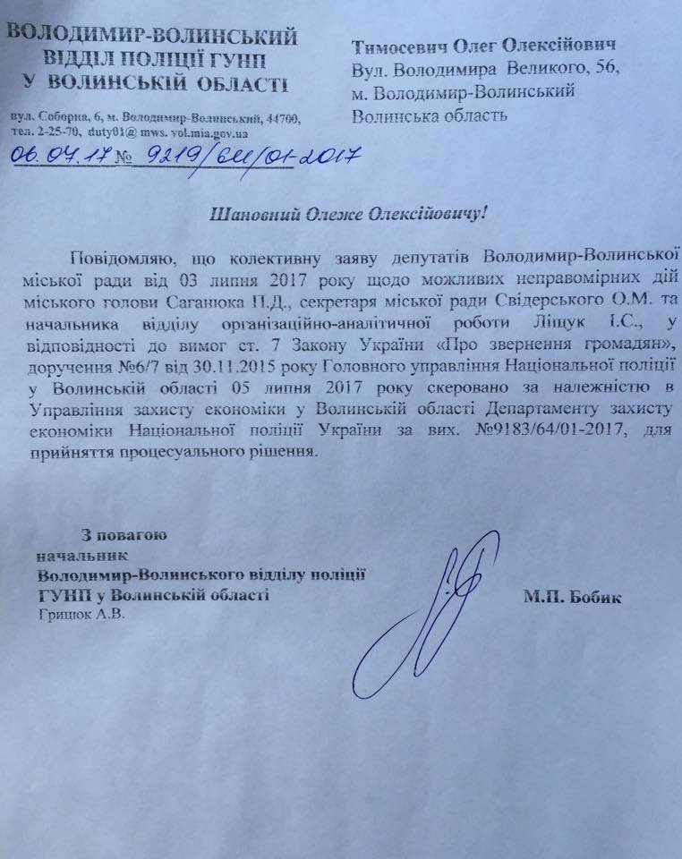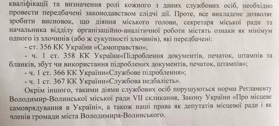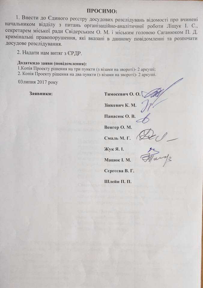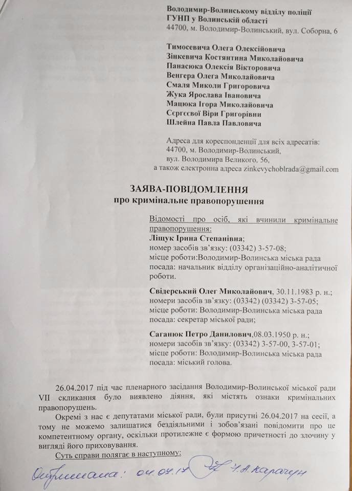 Тож він з колегами написали в поліцію повідомлення про злочин, який вчинили, на думку заявників, начальниця відділу з питань організаційно-аналітичної роботи виконкому міськради Ірина Ліщук, секретар ради Олег Свідерський, міський голова Петро Саганюкю