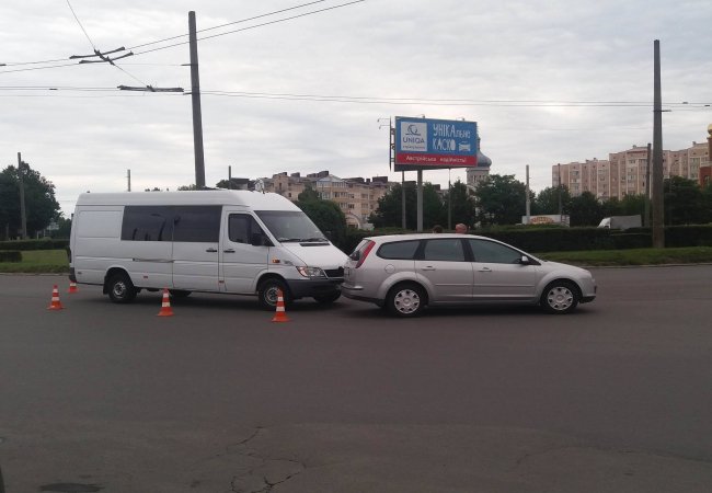 А на кільці біля магазину "Фуршет" не розминулися бус та легковик.