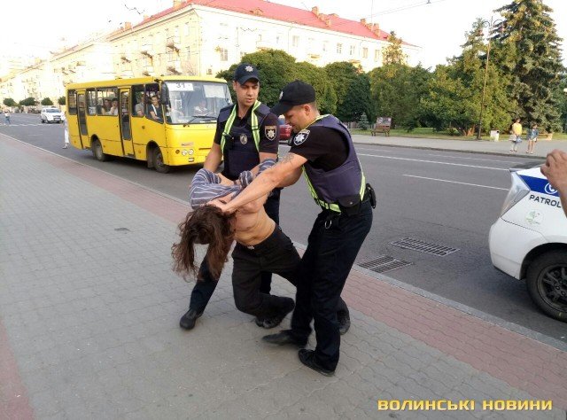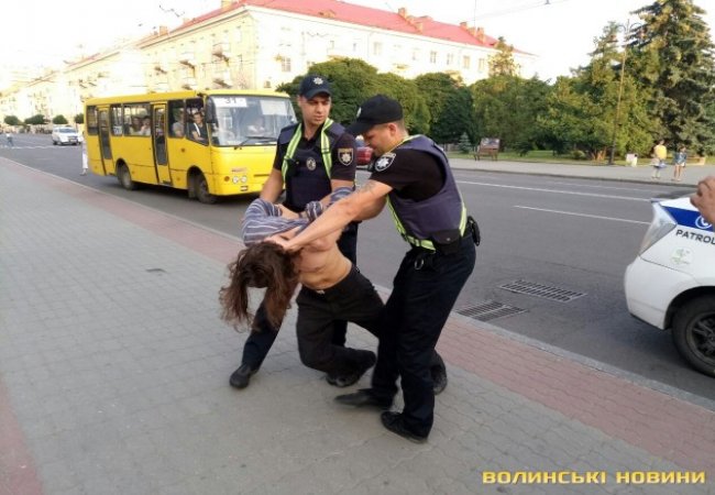 Поліцейські забрали хулігана до машини, незважаючи на супротив з його сторони.