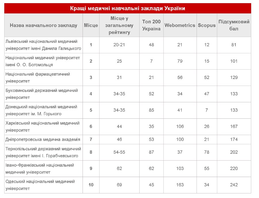 Усього їх 10, на першому місці – Львівський національний медичиний університет імені Данила Галицького. На останній позиції – Одеський національний медичний університет, – повідомляє Освіта.ua.