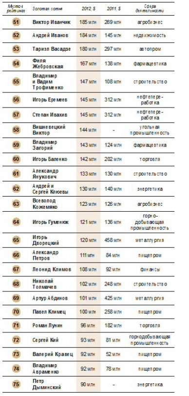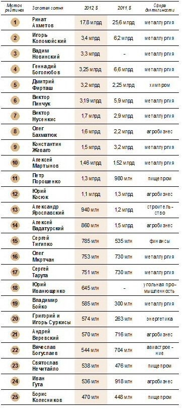 Загалом, список, який уже традиційно очолив донецький бізнесмен Ринат Ахметов зі статком у 17,8 мільярдів доларів США, виглядає так:
