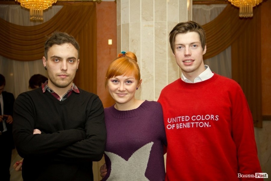 Подивитися на дизайнерські витвори прийшла журналістка Тетяна Зубрик. Поряд з Тетяною - місцеві рок-музиканти Андрій Собчук та Олег Бардюк.