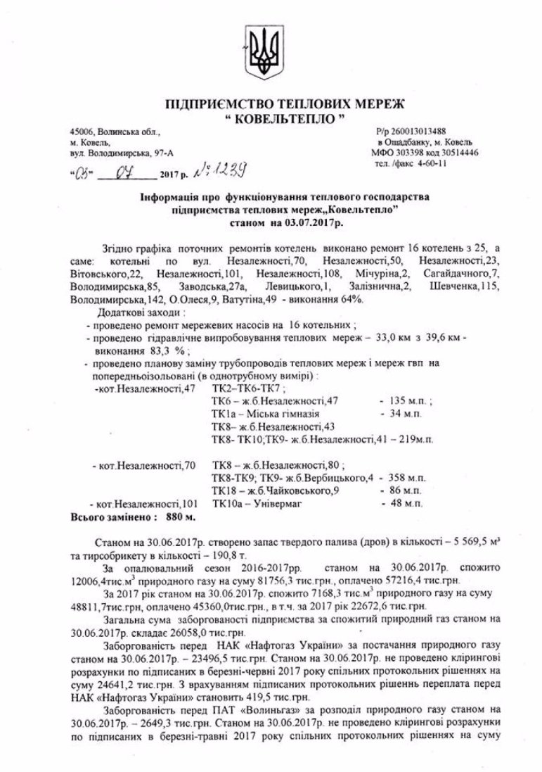 Загальна сума заборгованості ковельського підприємства теплових мереж за спожитий газ станом на 30 червня 2017 року складає 26 мільйонів гривень.