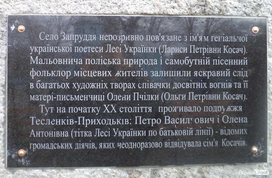 Розташування знаку не випадкове: саме Запруддя неодноразово відвідували Косачі, тут мешкали родичі Лесі Українки – подружжя відомих громадських діячів 19 століття Тесленків-Приходьків.