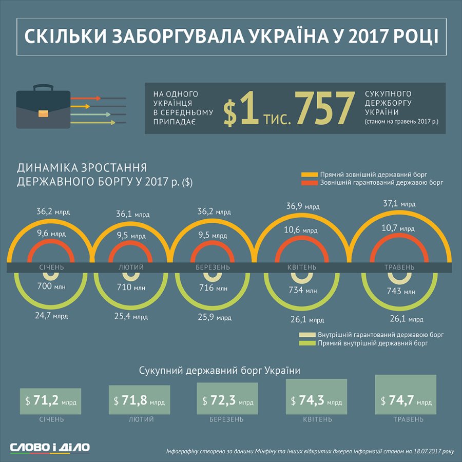 Станом на травень 2017 року сукупний державний борг України складав 74,7 млрд грн.