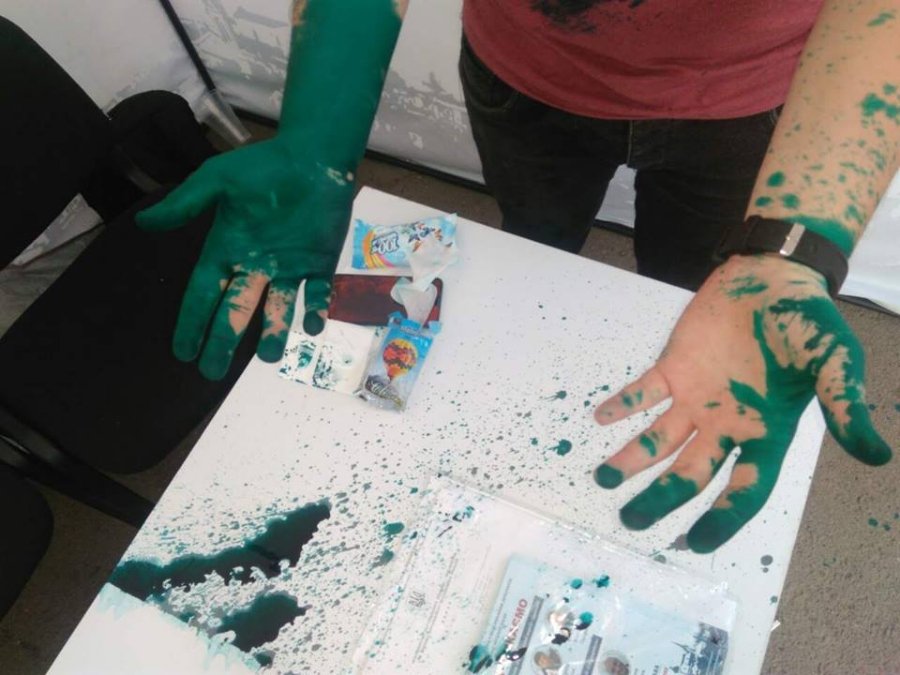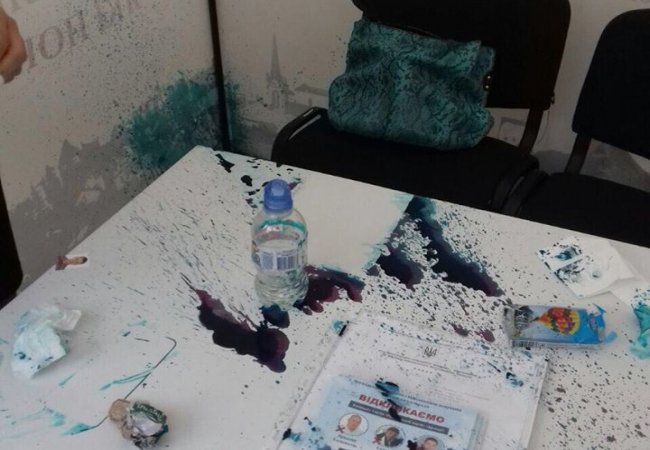 Молодик приїхав на таксі, вибіг з машини, виплеснув бік активістів пляшку зеленки та побіг до таксі, на якому й зник із місця пригоди.