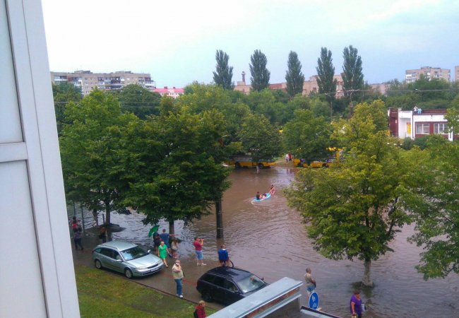 У Луцьку після сильної зливи затопило окремі вулиці. Це змусило людей пересісти на надувні човни.