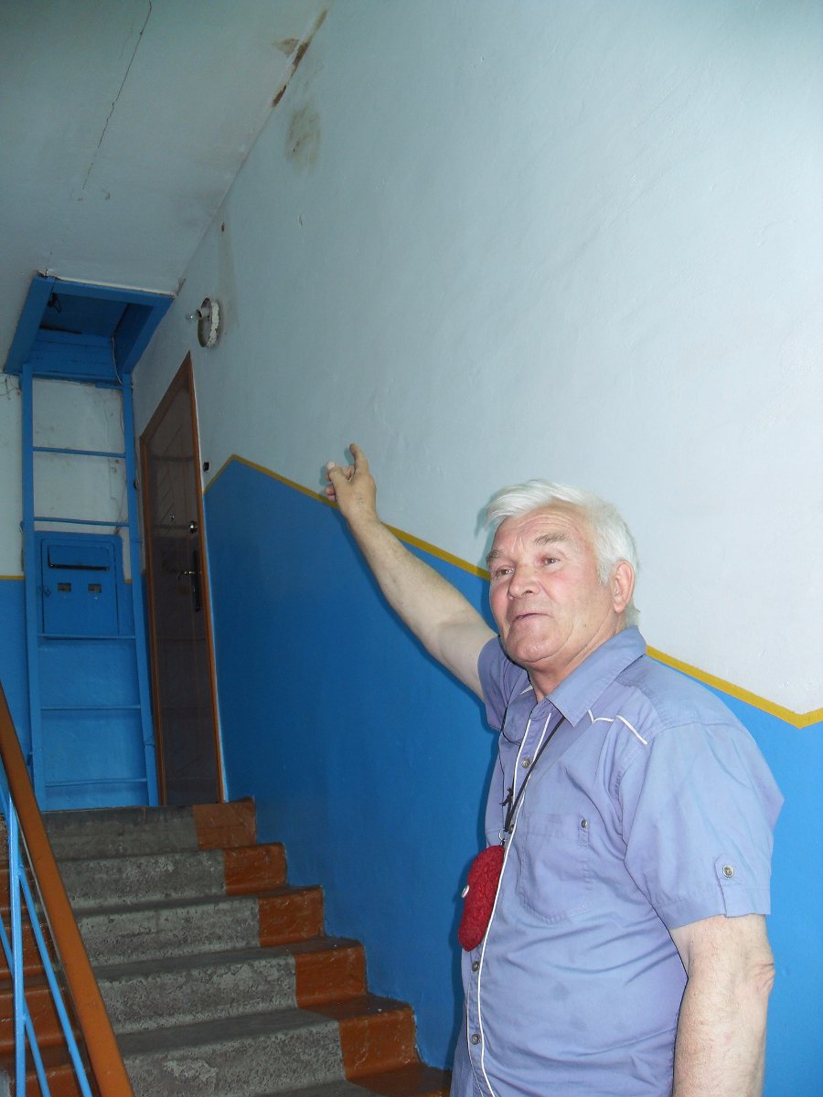 – Проблема — не перший рік. Тут давно потрібно ремонтувати, все валиться. Те, що я на другому поверсі живу, не має значення. Якщо протікає на четвертому поверсі, то дістається і решті. Ось дивіться, яка щілина… в палець. Кладка неякісна, цемент розсохся. Це ж не те, що цеглинка на голову впаде, це суцільна плита. А там їх таких дві. Нам уваги взагалі ніхто не приділяє. Ми самі по собі. Майже все обслуговування будинку на наших плечах. Питається: за що ми платимо і куди? Якби здоровіші були, то нікого про допомогу і не просили. У нас єдиний молодий мешканець на весь будинок, в основному тут інваліди і пенсіонери, яким вже за сімдесят.