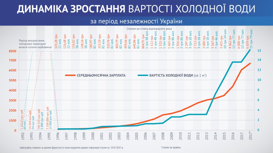 Якщо поглянути на період, коли в Україні діяла перехідна валюта, купоно-карбованець, а саме – з 1992 по 1995 роки включно, то вартість кубометра холодної води для населення виросла з 60 копійок до 15,8 тис. куп.-крб. Середня заробітна плата за цей час збільшилася з 1,532 тис. куп.-крб до 3,208 млн куп.-крб.