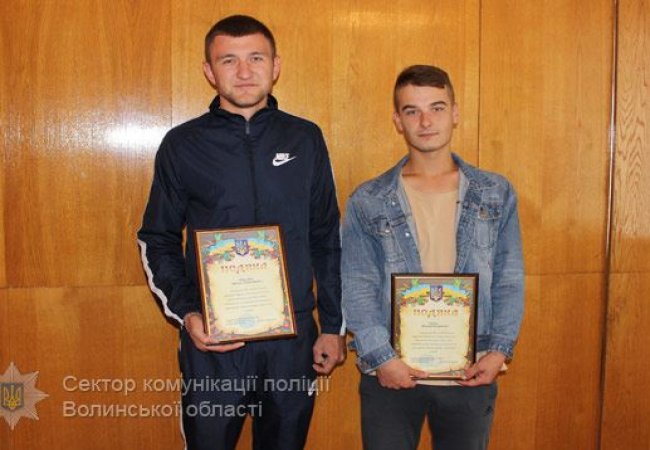Т.в.о. начальника Ковельського відділу поліції Василь Бучинський за особистий внесок у боротьбі зі злочинністю вручив подяки 26-річним жителям міста Ковеля – Горгуну Максиму та Прокопчуку Артему.