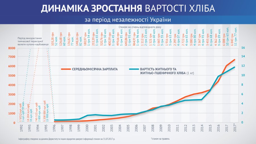 Із впровадженням чинної національної валюти ціна на цей продукт встановилася на рівні 52 копійок, тоді як середня з/п по країні становила 103,28 грн. Через 5 років, у 2001-му, хліб коштував уже 1,65 грн., а заробіток пересічного українця складав 253,39 грн.