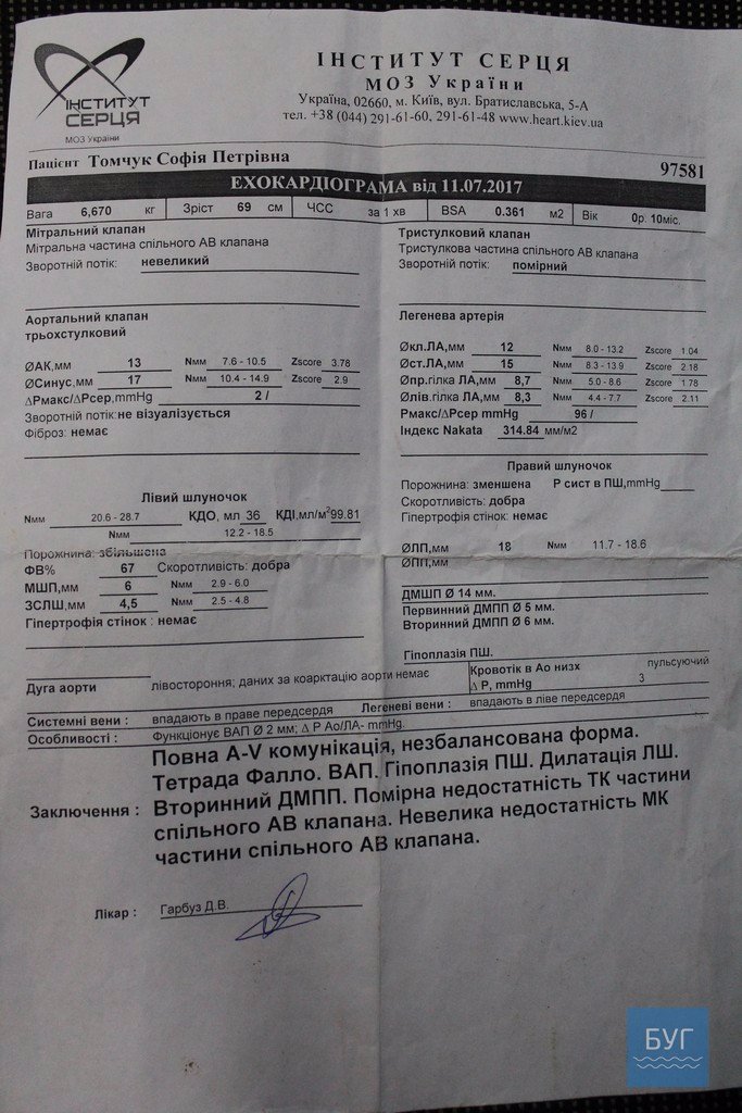 Лікарі поставили дитині ряд страшних діагнозів, серед яких: повна атріовентрикулярна комунікація незбалансованої форми, тетрада Фалло, гіпоплазія правого шлуночка, дилатація лівого шлуночка. Як розповідає мама дівчинки Тетяна, медики не давали жодних шансів на те, що її донька буде жити.