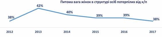 За словами заступника начальника-начальника аналітичного управління Департаменту організаційно-аналітичного забезпечення та реагування Нацполіції Бориса Вежнавця, протягом 2017 року за кримінальними провадженнями направленими до суду, потерпілими від злочинних посягань визнано майже 77 тис. жінок. Що становить 38% від загальної кількості потерпілих.