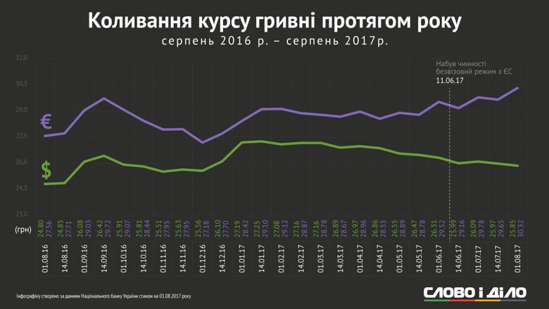 За рік, що минув із серпня 2016-го, курс євро та долара двічі різко піднімався, але відносно різке зниження вартості валют ЄС і США було лише одне.