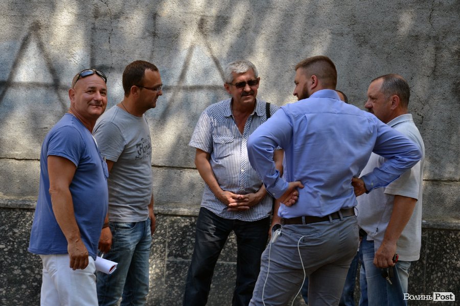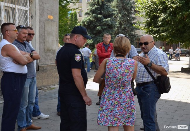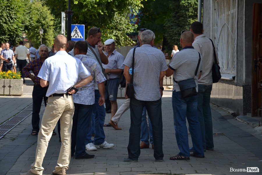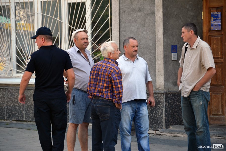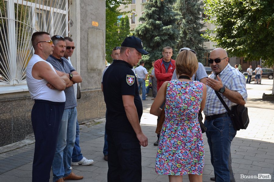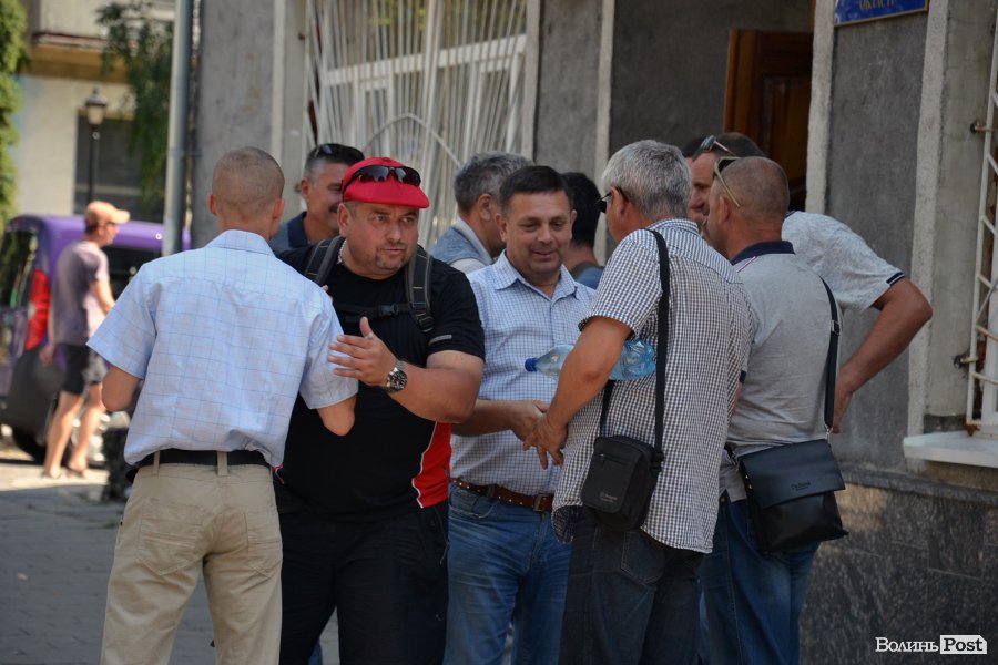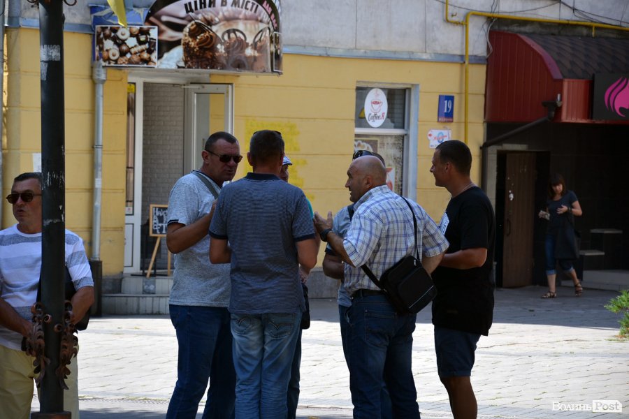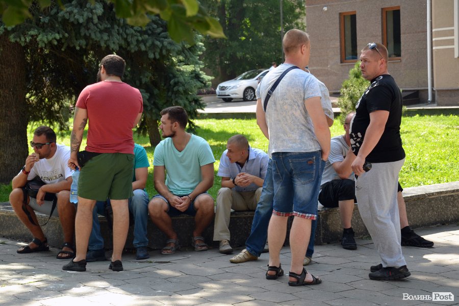 Це учасники Спілки афганців, Спілки воїнів АТО Волині та "Варти порядку". Більшість з них поводяться тактовно та гречно розмовляють з журналістами. Але, на жаль, повторюються інциденти, які траплялися вчора, 9 серпня, під час мітингу біля СБУ.
