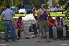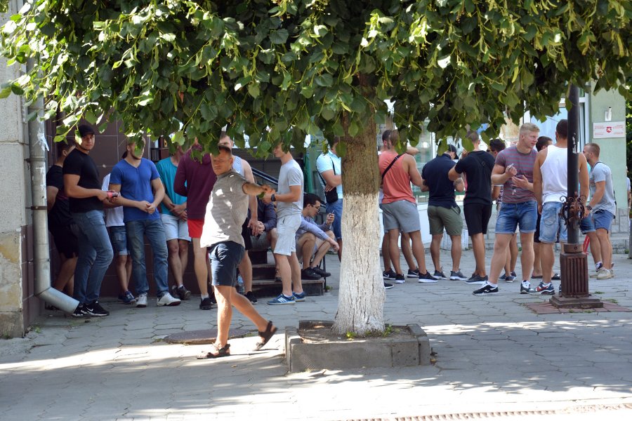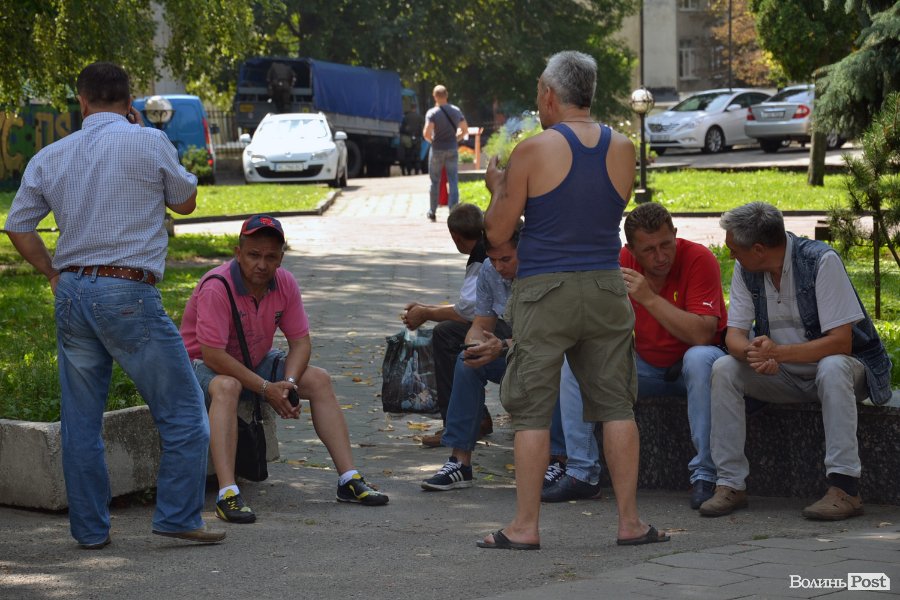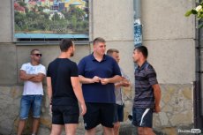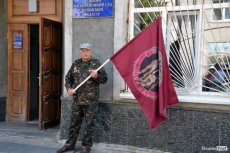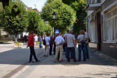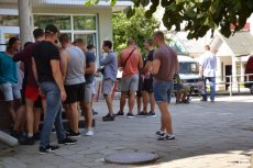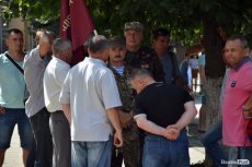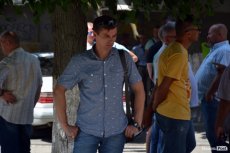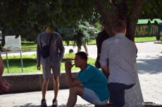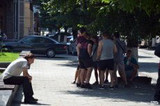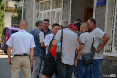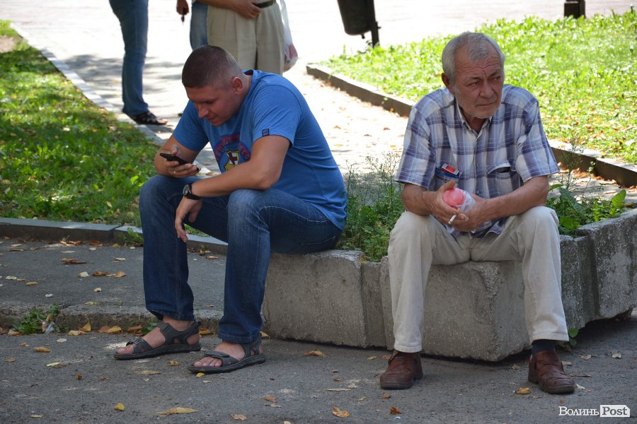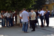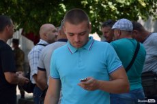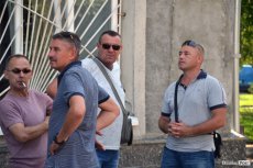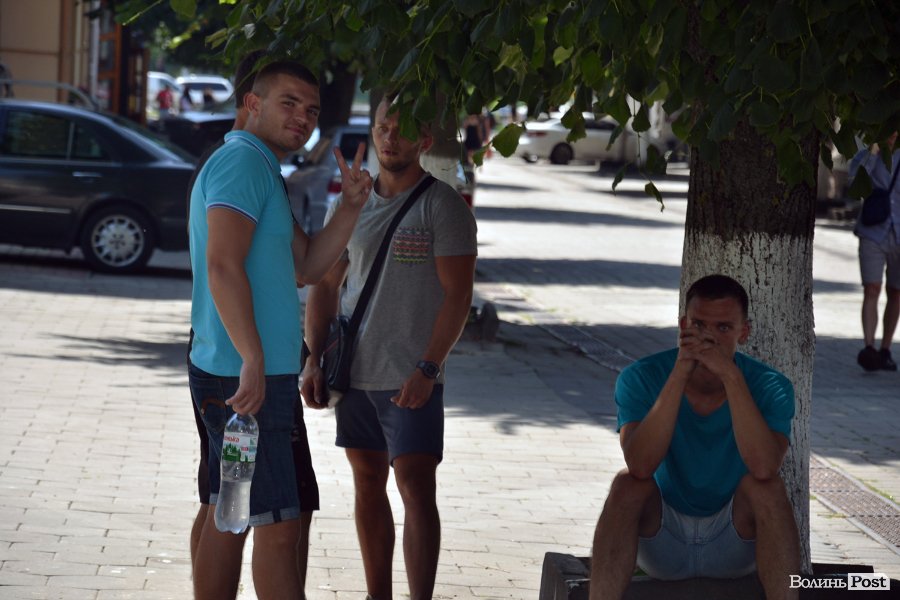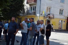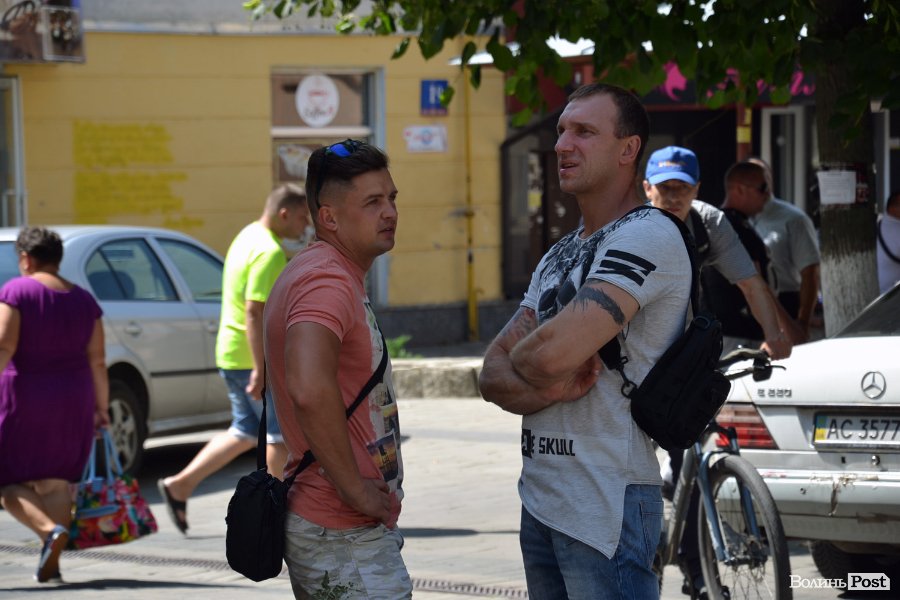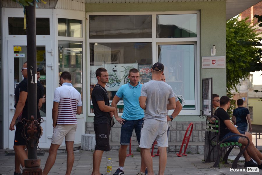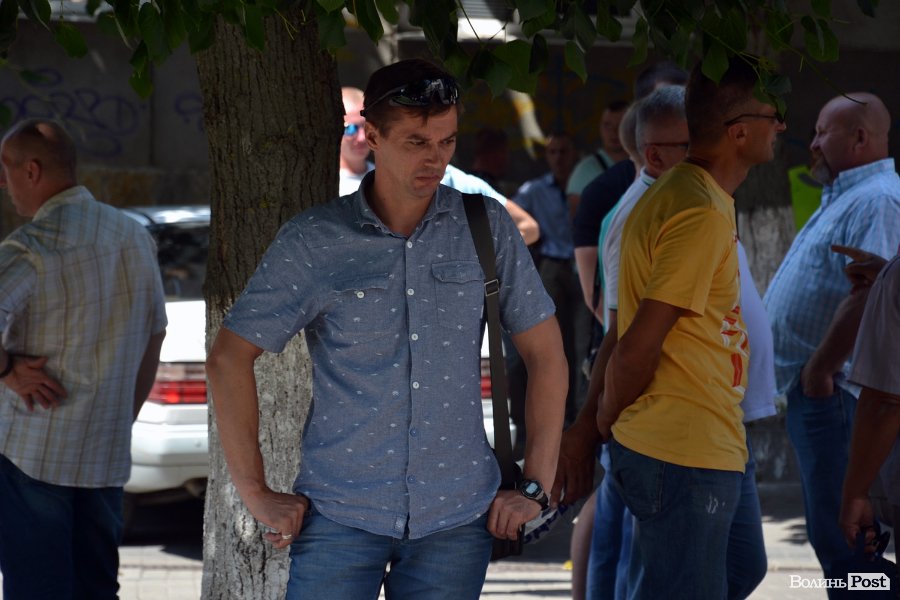 Це учасники Спілки афганців, Спілки воїнів АТО Волині та "Варти порядку". Більшість з них поводяться тактовно та гречно розмовляють з журналістами. Але, на жаль, повторюються інциденти, які траплялися вчора, 9 серпня, під час мітингу біля СБУ.
