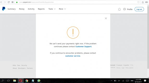 Кілька днів українські користувачі, при спробі перевести гроші у PayPal, не можуть цього зробити. Система видає помилку та пропонує звернутись у техпідтримку, - повідомляє канал 24.