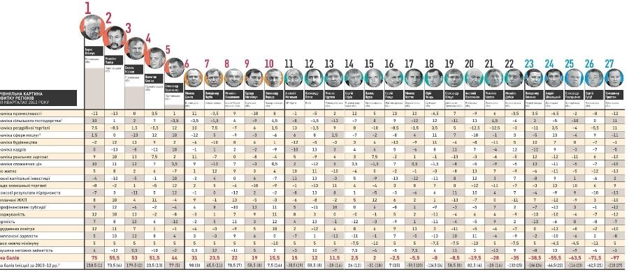 У дванадцяти керівників ця сума виявилася негативною, і це говорить про те, що ввірені їм регіони в 2010-2012 роках за 20 критеріями у більшій мірі відносилися до аутсайдерів, ніж до лідерів. Правда, чотирьох з цих керівників призначили порівняно нещодавно - у другій половині 2011 року. Однак інші вісім пропрацювали достатньо.