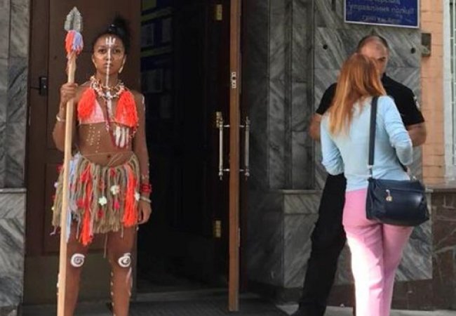 Організатор руху Femen Ганна Гуцол пояснила журналістам: "Це вбрання племені "українські людоїди". Бо Україна, в якій людей судять за мирний протест, - це варварська країна".