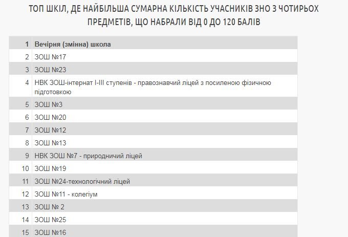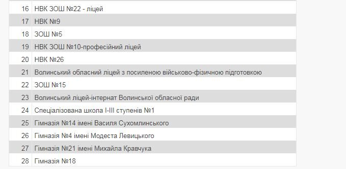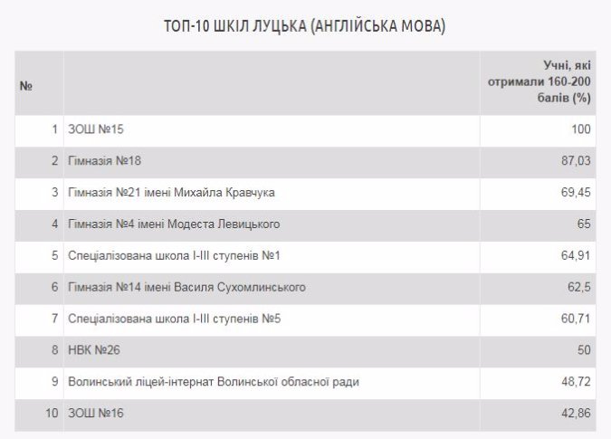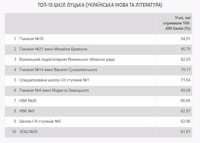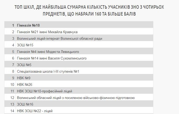 У таких гімназія як 4, 21 та 18 узагалі немає учнів, які б не подолали мінімальний поріг із зазначених предметів. Таких учнів, до слова, не має і вечірня луцька школа, але тут ЗНО здавало не так багато осіб.