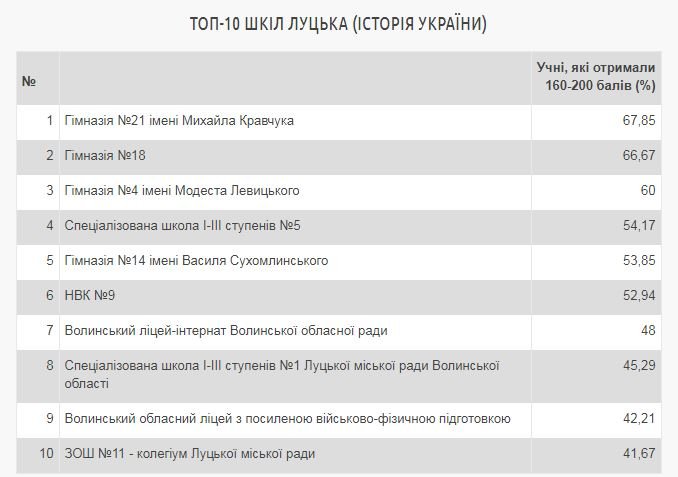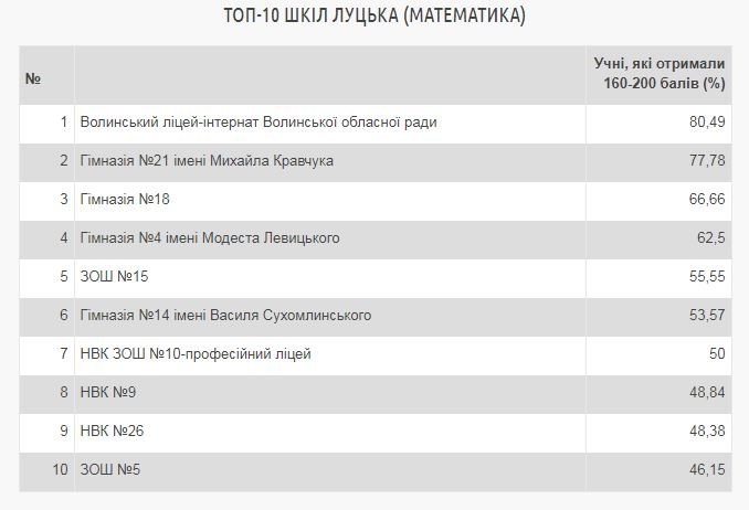 На основі цієї інформації, склали ТОП-10 луцьких шкіл, гімназій, ліцеїв, де найбільший відсоток учнів, які отримали 160 та більше балів за кожен із предметів.