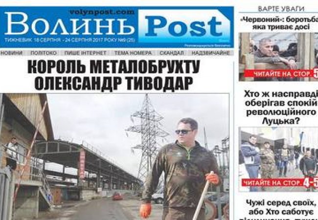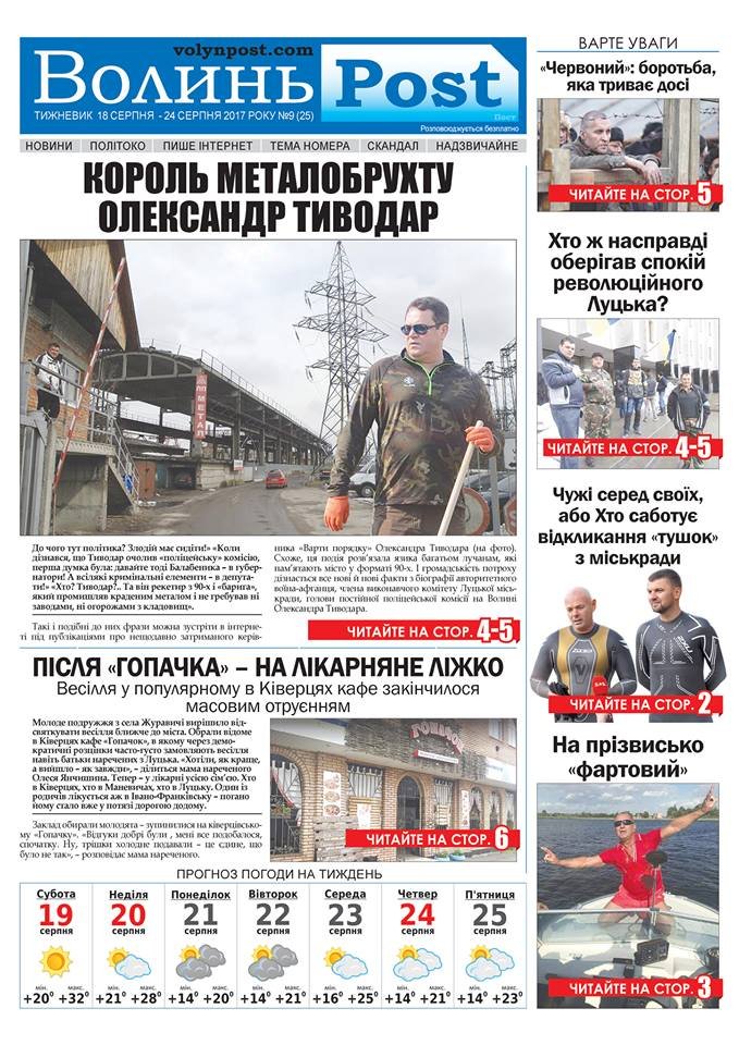 «Король металобрухту Олександр Тиводар». Газета друкує маловідомі подробиці «темного» минулого нинішнього голови громадського формування «Варта порядку» Олександра Тиводара, якого сьогодні підозрюють у незаконному стеженні, зберіганні зброї й боєприпасів, організації побиття громадських активістів.