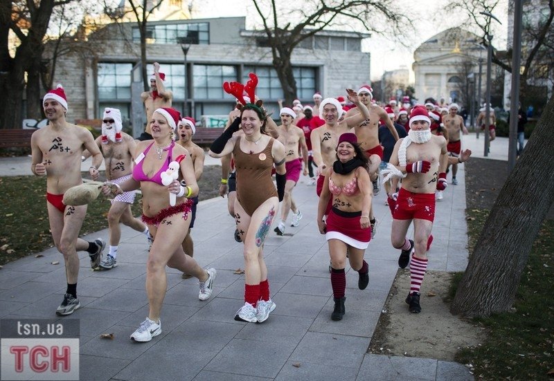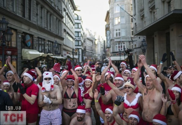 Група людей, вдягнених у капелюхи Санта Клаусів та у купальні костюми влаштували веселий забіг вулицями Будапешта, повідомляє ТСН.