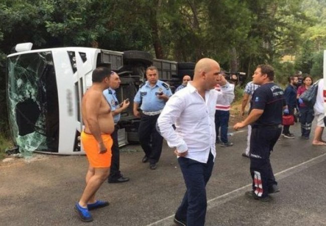 За інформацією журналістів, мікроавтобус перекинувся в понеділок на виїзді з тунелю на трасі Анталія-Кемер. За попередніми даними, водій не впорався з керуванням через дощ. Туристи були госпіталізовані.