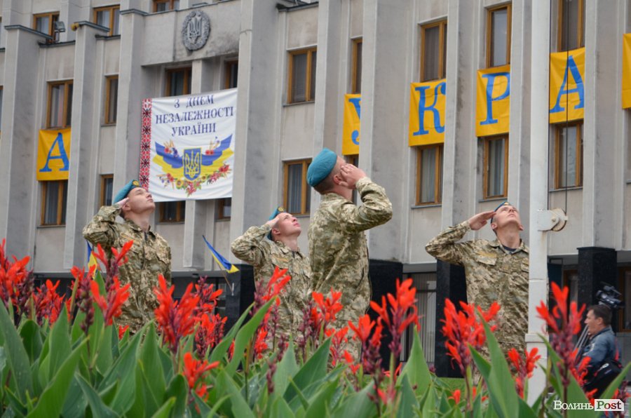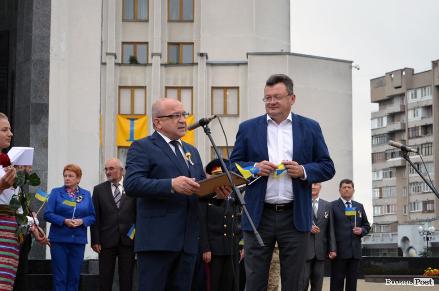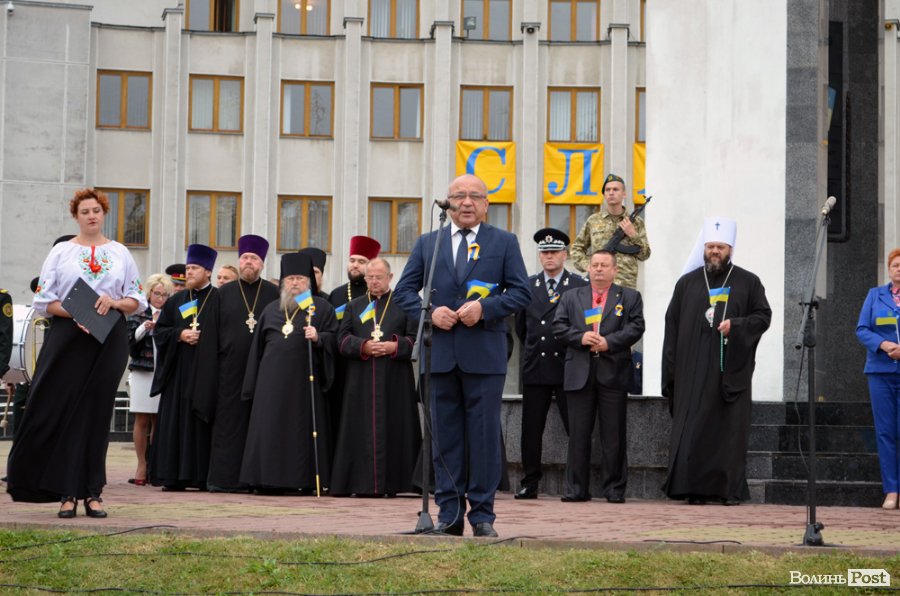 «Вже доброю традицією стає напередодні Дня Незалежності підіймати український прапор – символ нашої держави. Гордість кожного українця, що ось уже 26 років на площах, вулицях, в скверах в цей день ми віддаємо шану тим, хто боровся та бореться за нашу незалежність під гордістю нашої держави – українським прапором», - промовив голова Волинської обласної держадміністрації Володимир Гунчик. Він пригадав, як в окупованій частині України піднімають прапори, а людей за це саджають у тюрми. Саме цей прапор гордо майорить над бліндажами та окопами наших військових на Сході – він , пробитий кулями і окроплений кров’ю, є символом нашої перемоги.