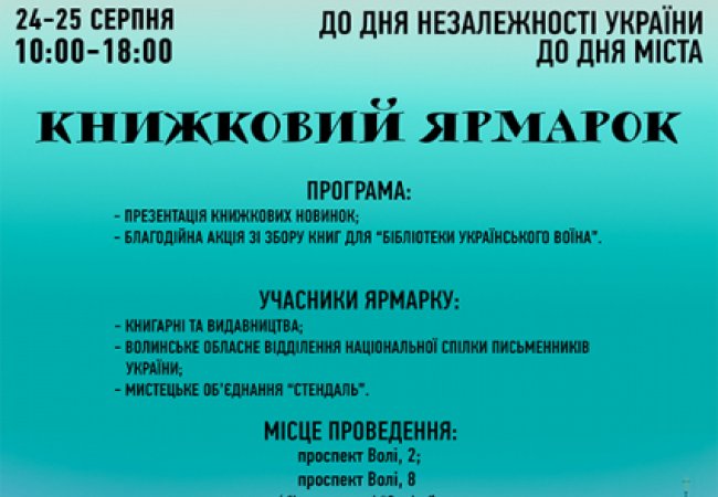 У Луцьку 24-25 серпня в рамках заходів з нагоди Дня Незалежності України та Дня міста Луцька на проспекті Волі відбудеться Книжковий ярмарок за участі книгарень та видавництв.