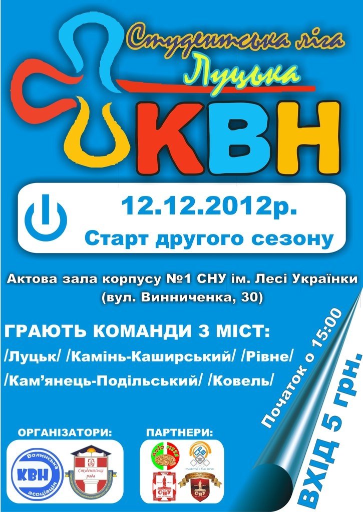 Участь в грі прийматимуть 15 студентських команд КВН з Луцька, Ковеля, Рівного, Камянця-Подільського, Тернополя, Каменя-Каширського.